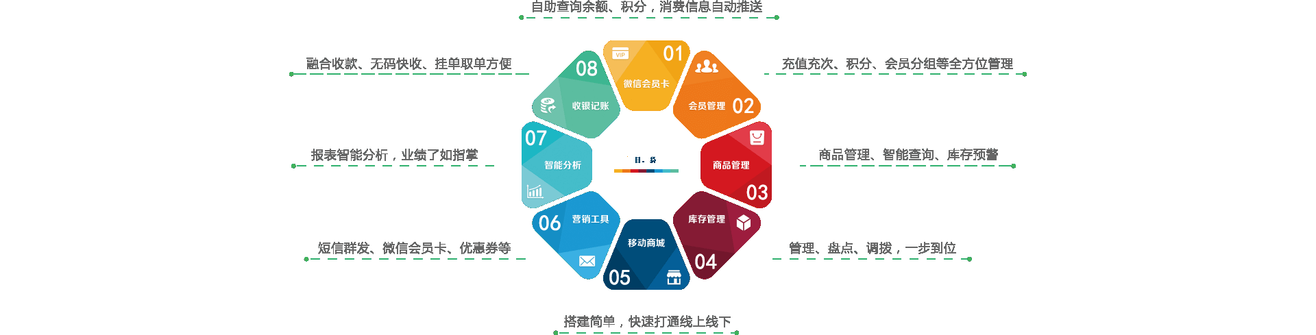- 会员管理:会员档案、会员积分、积分兑换、会员等级、会员充值、会员生日、会员消费分析、手机短信(会员消费短信、会员生日短信、会员充值短信等)、会员介绍人、三级分销、线上线下对接等