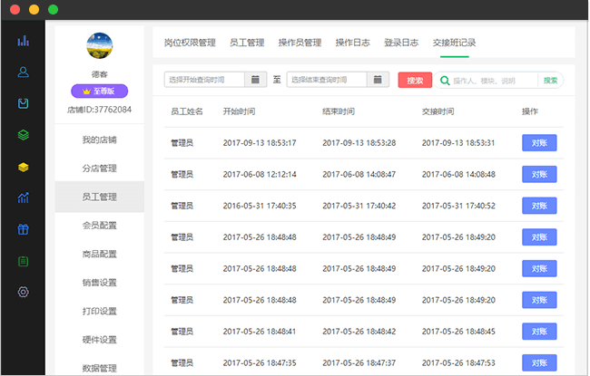 支持多个收银员轮班收银,交班结束即可打印收银对账单